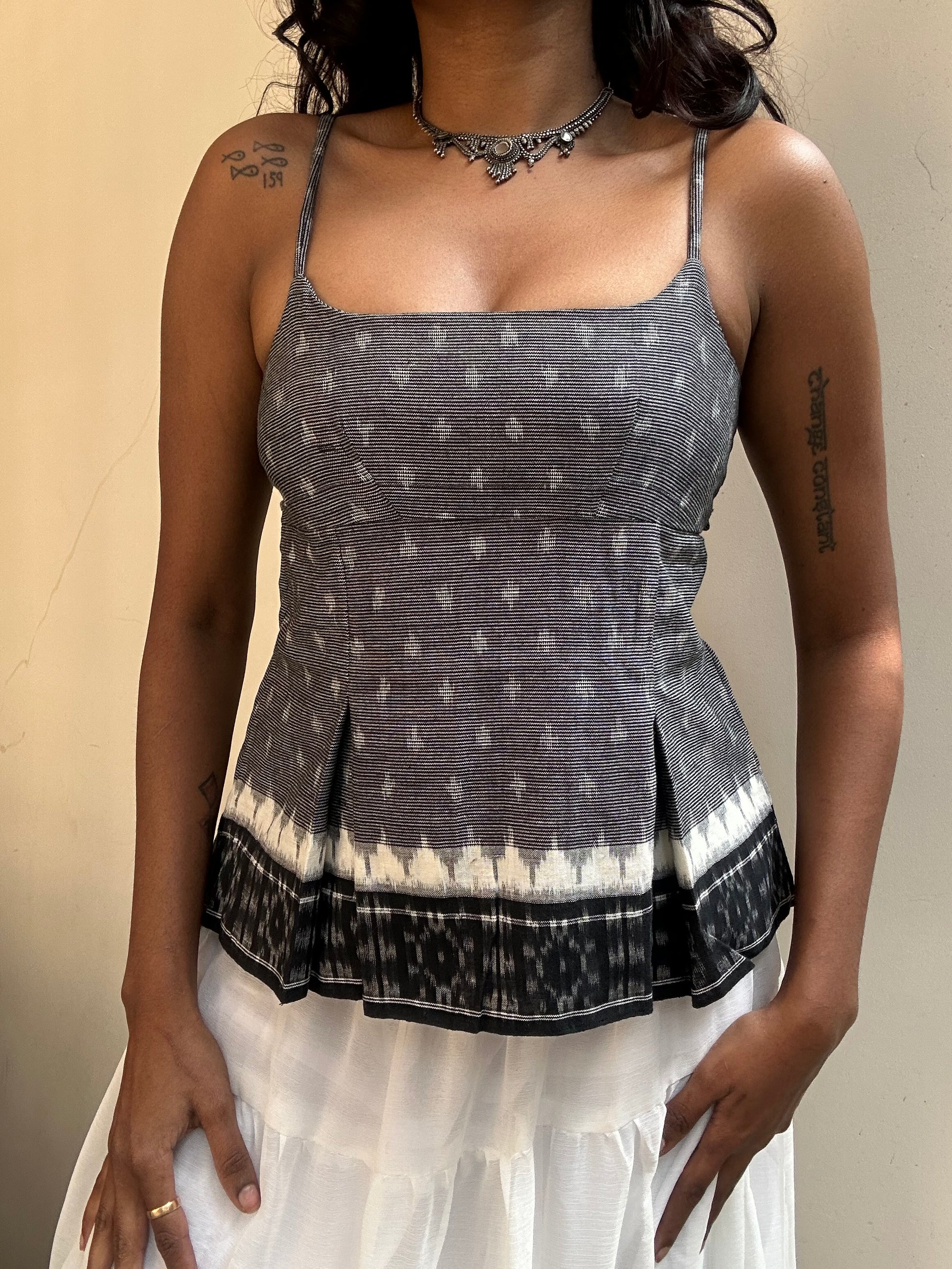 A spaghetti top with subtle box pleats, crafted for the friend who carries culture in her art and gentleness in her presence. The snatched look is achieved by the tie-up strap details at the back!