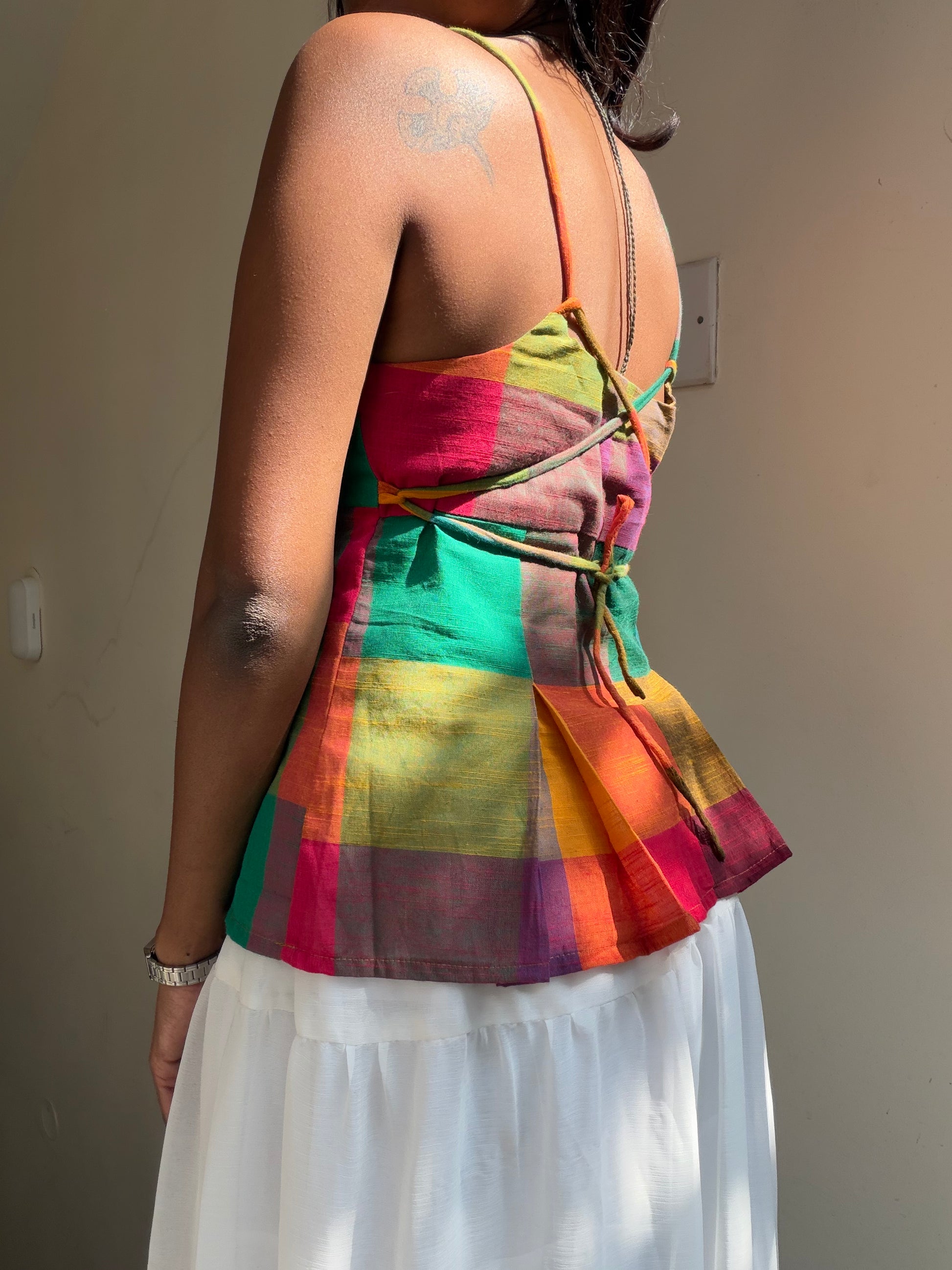 A spaghetti top with subtle box pleats, crafted for the friend who carries culture in her art and gentleness in her presence. The snatched look is achieved by the tie-up strap details at the back!