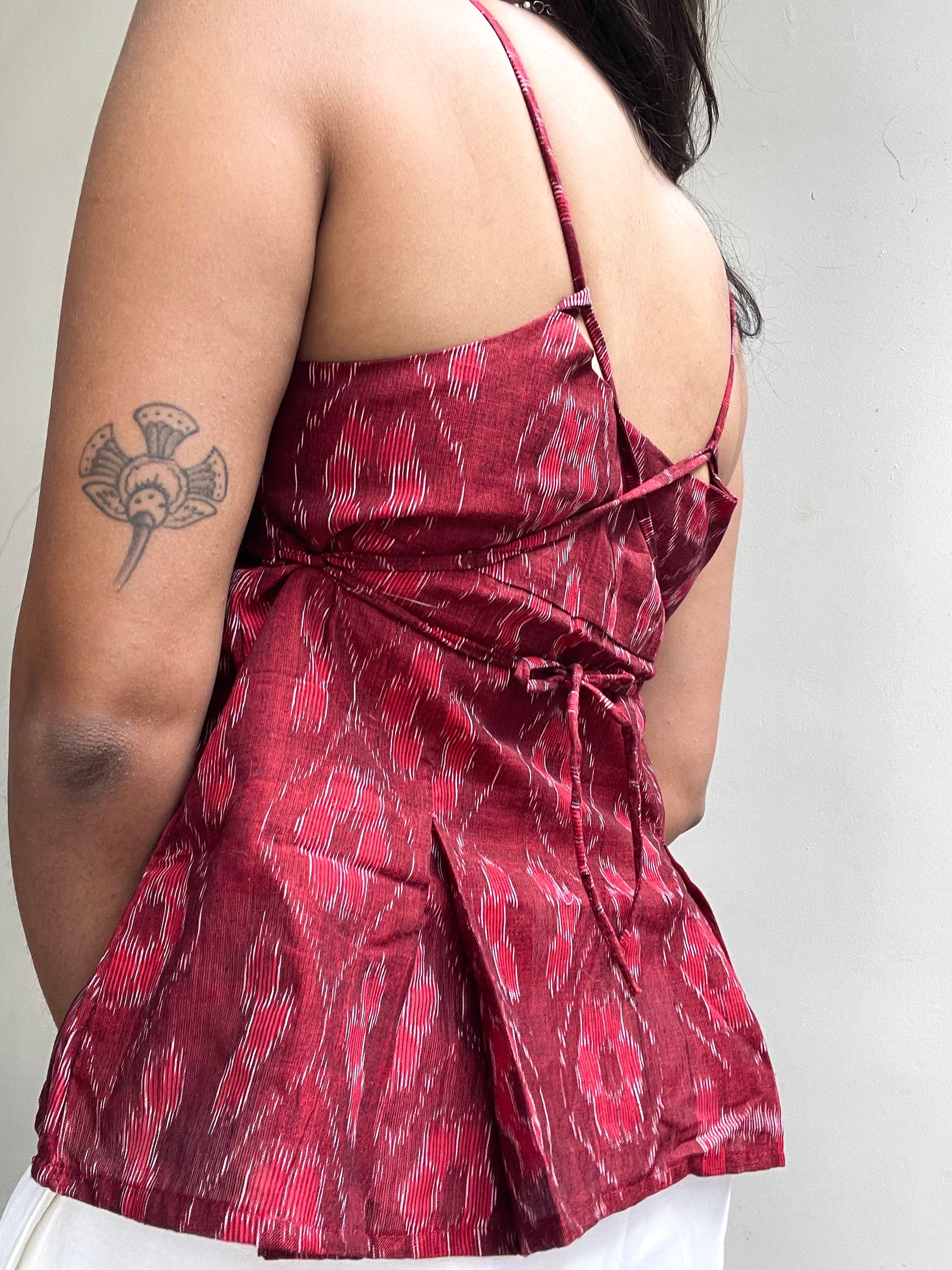 A spaghetti top with subtle box pleats, crafted for the friend who carries culture in her art and gentleness in her presence. The snatched look is achieved by the tie-up strap details at the back!
