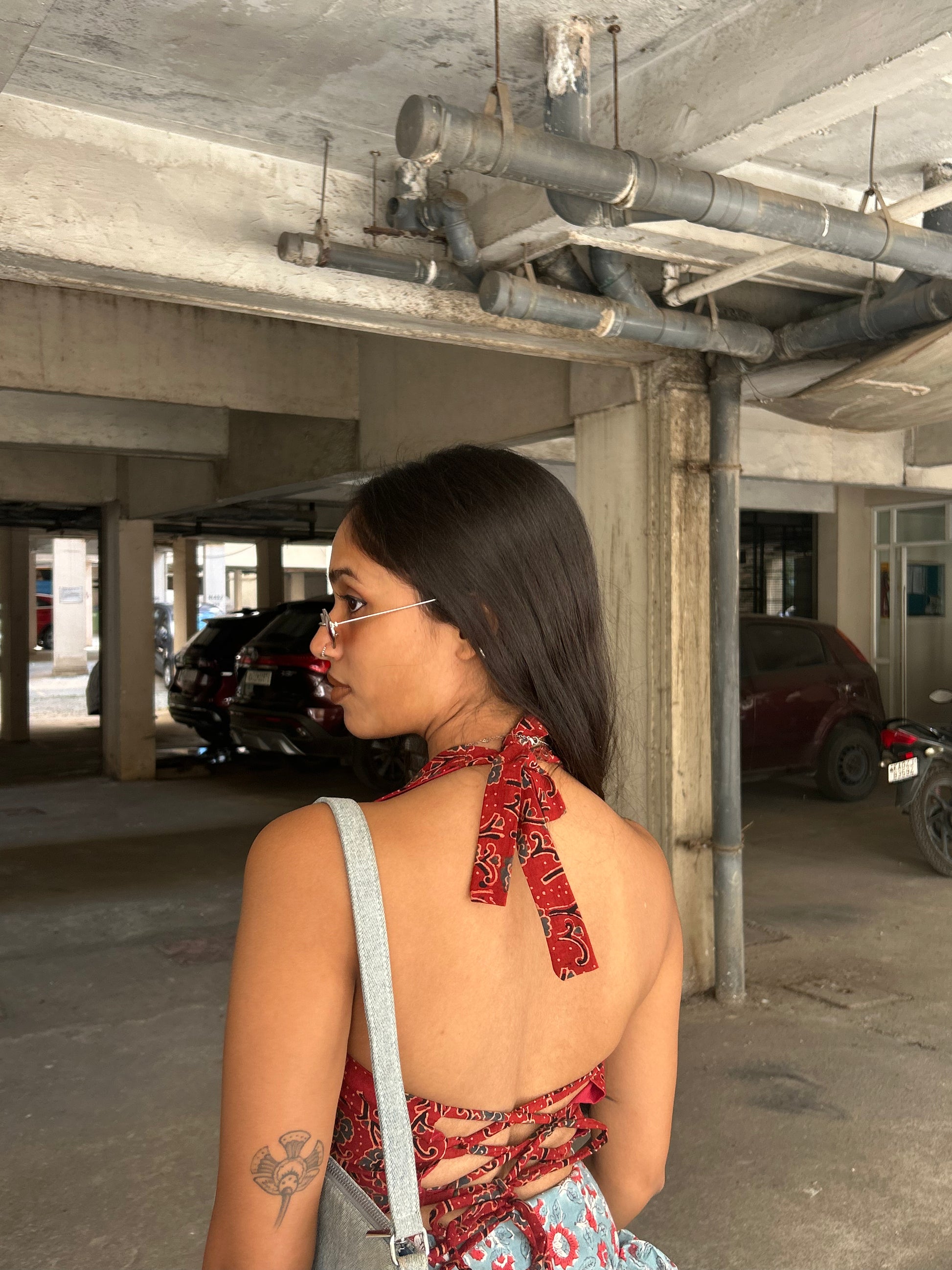 Enclosure: Tying at neck, Tie-up back with criss cross pattern