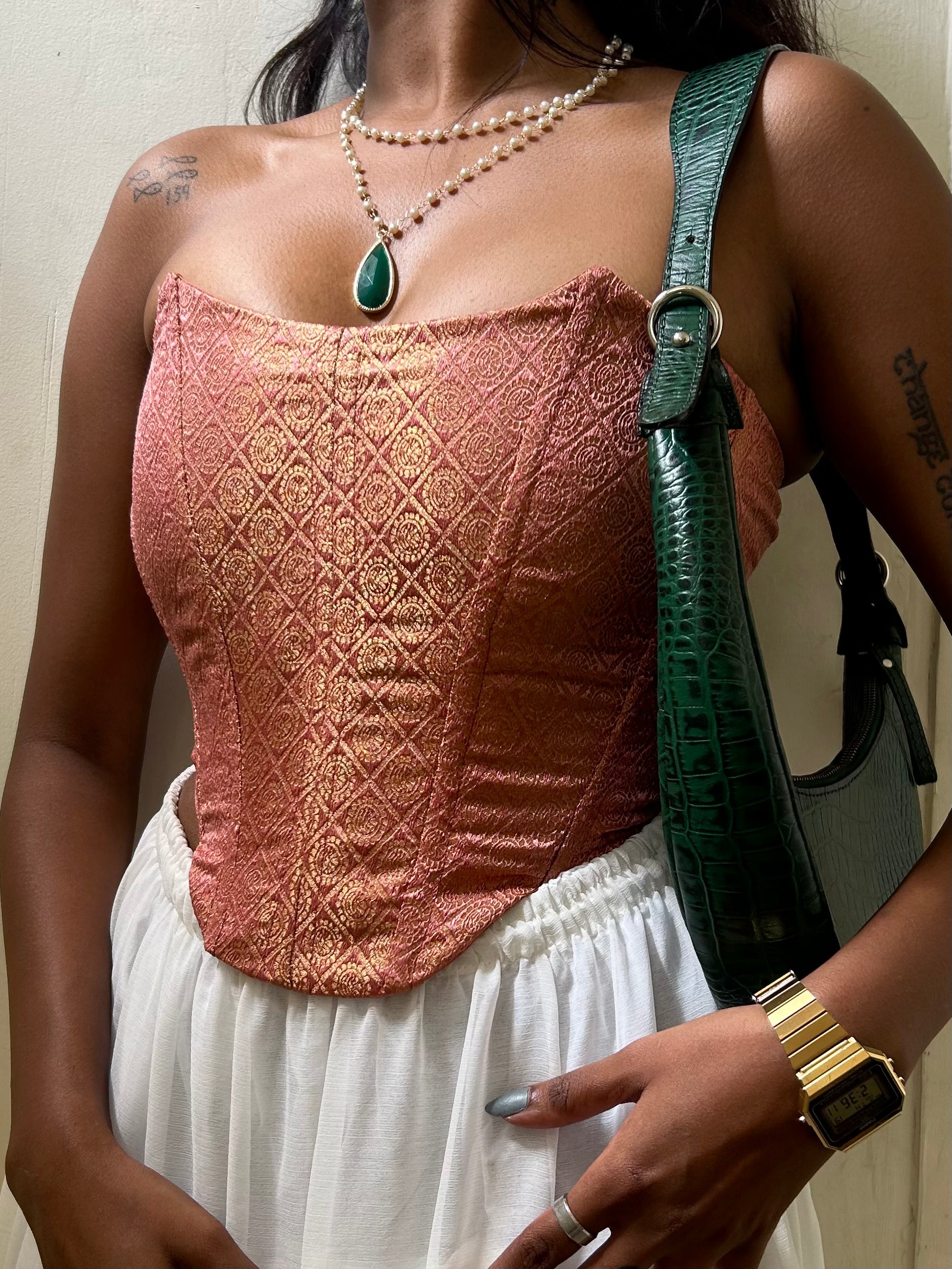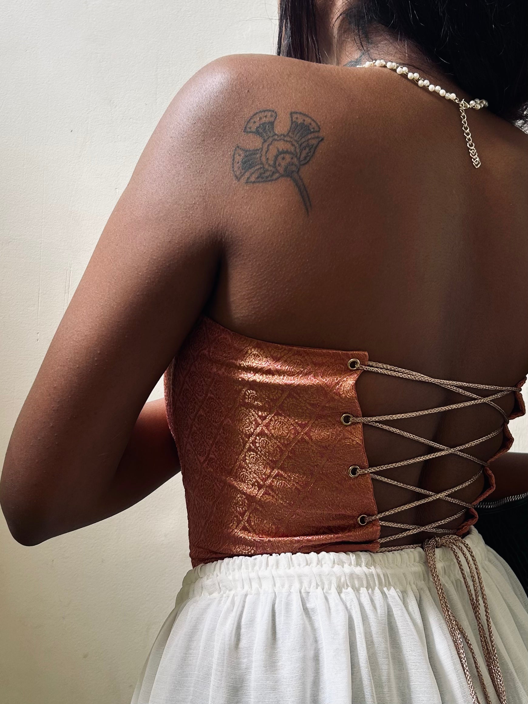 Meet our Kumari Corset is where sharp structure meets soft rebellion—a bold reimagining of desi femininity with just the right edge. Designed to sculpt and command, it's a piece that speaks in curves and confidence.