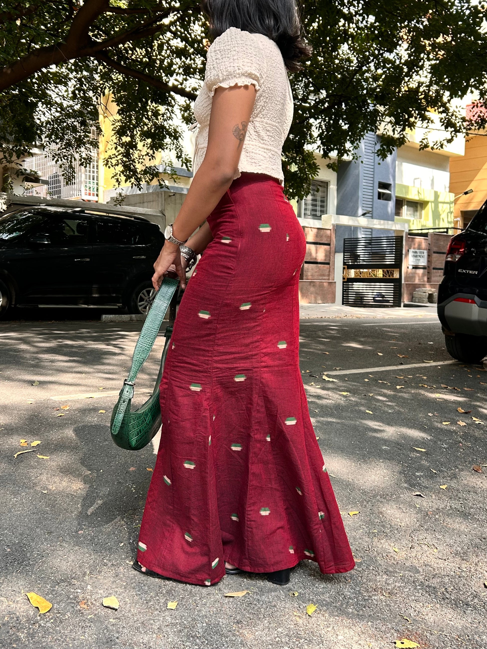 Say hello to Meena — the skirt that moves like a dream. With a flattering mermaid silhouette and flowing godet panels, she hugs in all the right places and flares with every step.