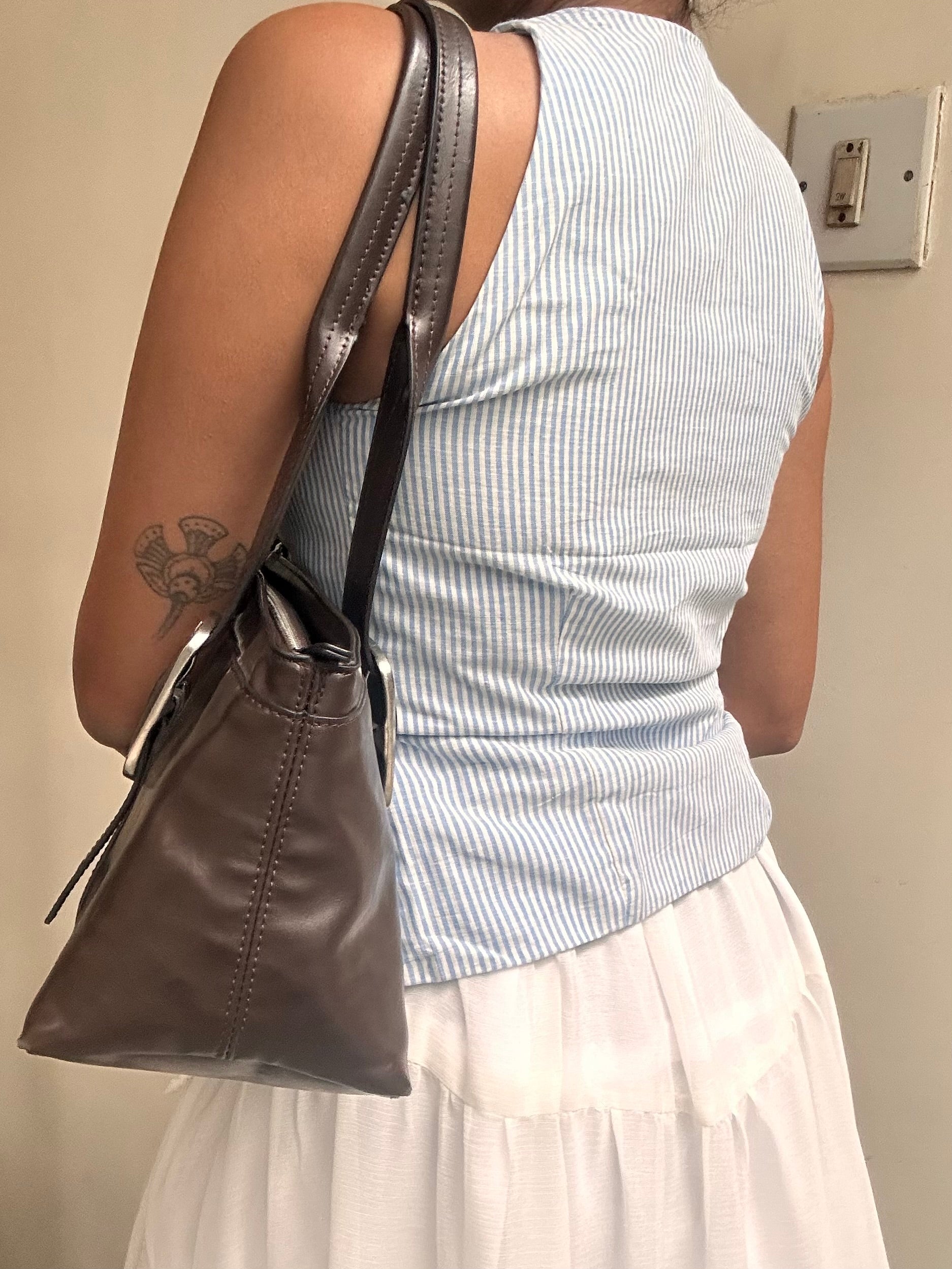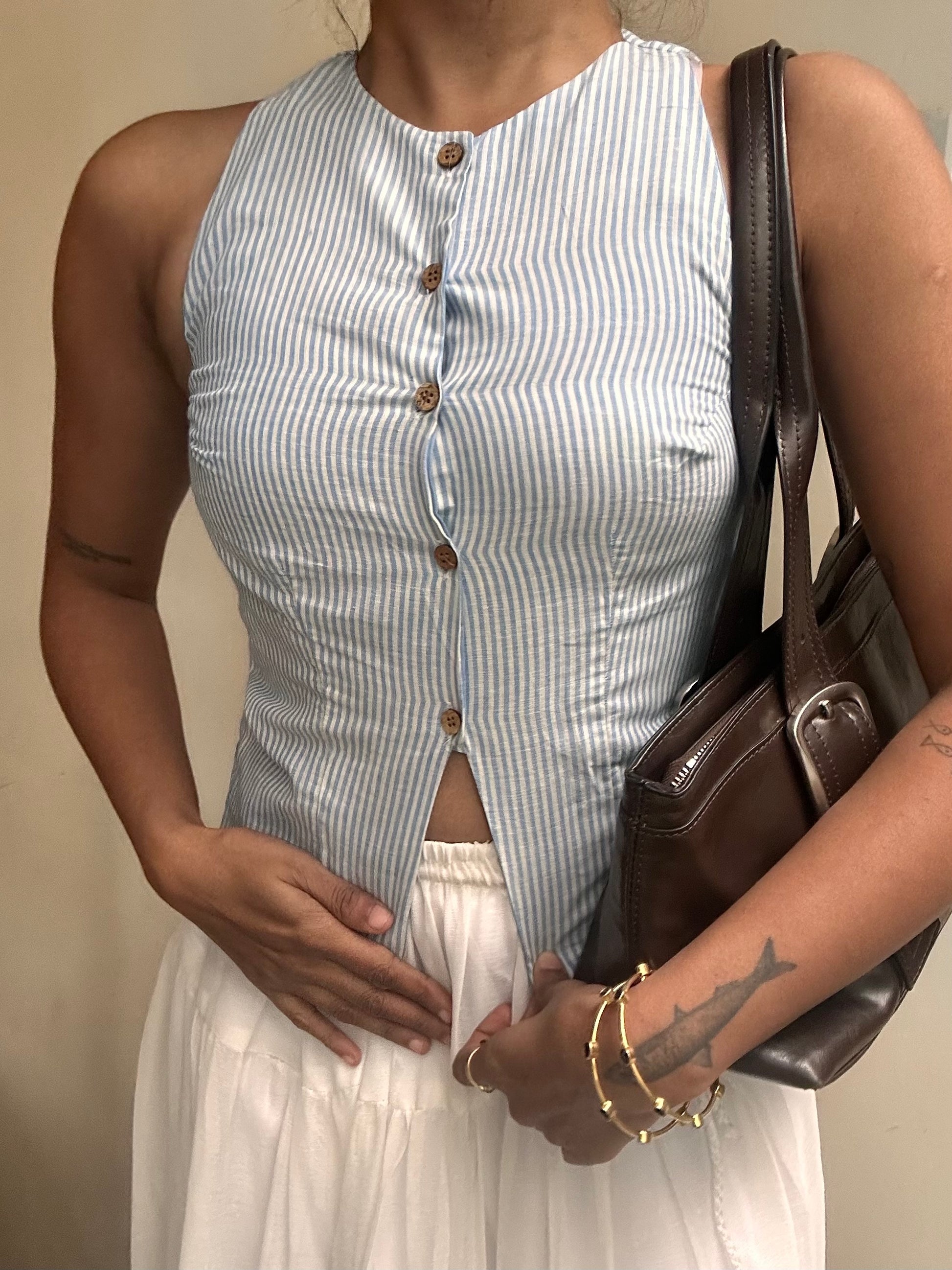 Naira isn’t just a top—she’s an attitude. Buttoned-up with a halter twist, she brings sharp lines and soft power to your everyday. Think desk to drinks, with a side of “who is she?” She’s the kind of staple that turns routines into runways.